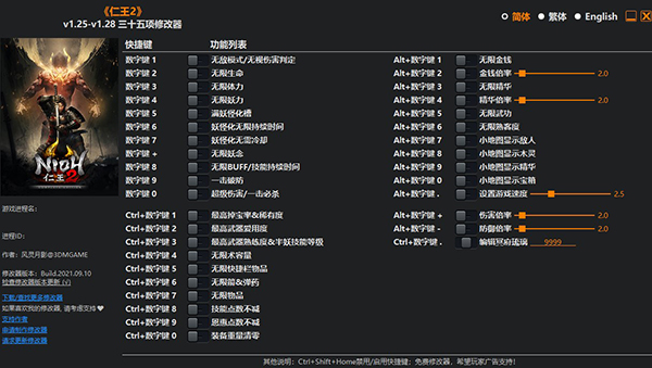 仁王2修改器是针对于仁王2游戏制作而成,由知名大神风灵月影制作而成,能帮助用户轻松修改游戏内的诸多数据,拥有数十项强大的修改功能,如无限生命、无限体力、无限妖力、一击必杀、无限物品、无限金钱等修改功能,并且使用起来十分简单易上手,丝毫不会为游戏带来任何卡顿,为喜爱仁王2游戏的玩家带来了极大的便利性与畅快的游戏体验感。为了帮助玩家感受更加游戏所带来的乐趣。