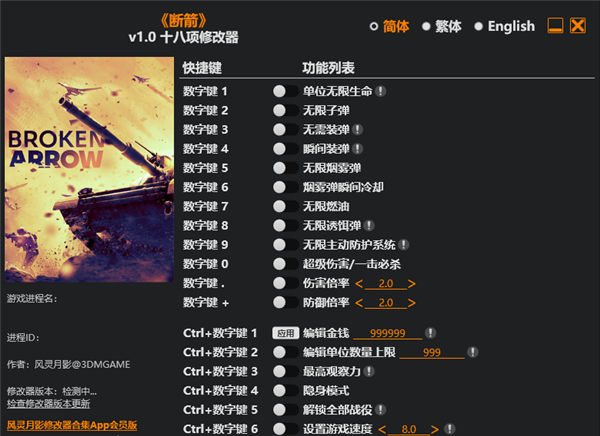 断箭修改器是一款专门为《断箭》游戏所推出的游戏数值修改器,它内置十八项不同的修改功能,玩家可拥有无限子弹、瞬间装弹、无限主动防护系统以及一击必杀等设定,还可自行编辑金钱和单位数量、设置隐身模式,帮助玩家完成波罗的海地区的战役任务,在基于真实地点设计的地图中,自由选择战术专精与难度等级,对抗出现的各类 AI 战斗群。