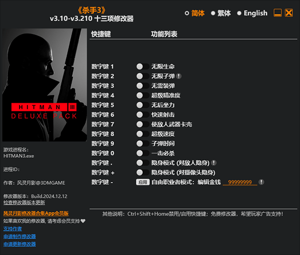 杀手3修改器是由风灵月影针对于杀手三部曲最终作品《杀手3(HITMAN 3)》制作的一款游戏多功能修改器,它能够为杀手3的玩家提供无限生命、无限子弹、无需装弹、超级精准度、快速射击等修改功能!并且,杀手3修改器使用非常简单,玩家只需打开游戏再打开修改器,按照功能按键进行开启功能即可生效!