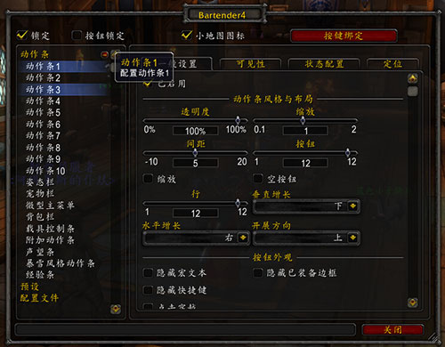 4、可以在插件图形配置界面内设置各个动作条的外观和动作,解锁以拖动动作条到任意位置‘